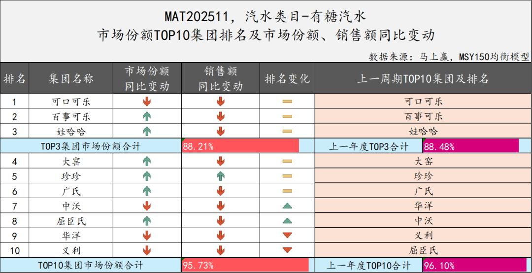 2024年12月至2025年11月,有糖汽水类目TOP3仍然由可口可乐、百事可乐和娃哈哈构成,其市场份额合计达到88.21%,相较上期有微弱下降,整体市场集中度稳定保持在很高的水平。