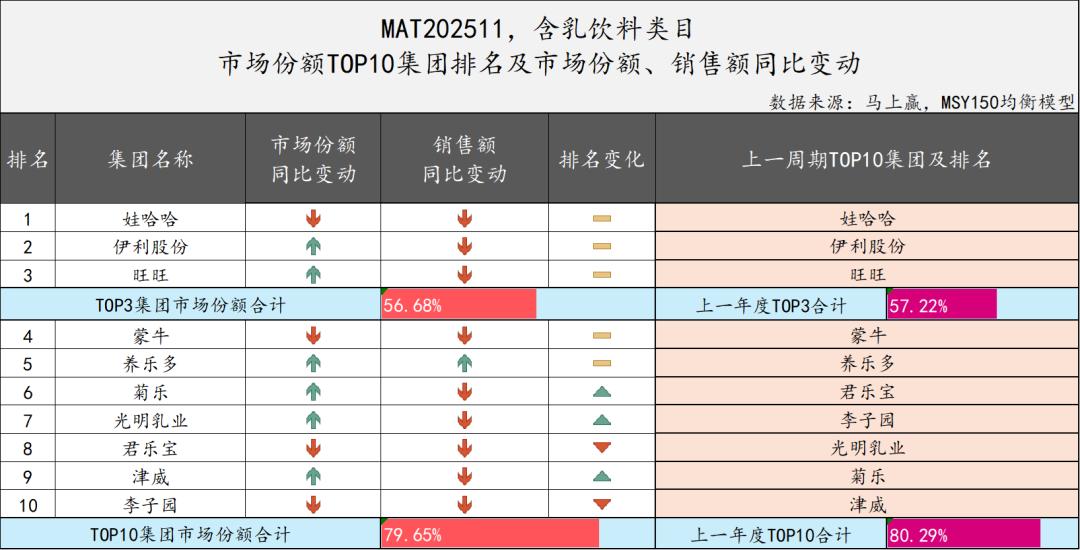 2024年12月至2025年11月,含乳饮料类目TOP3集团仍由娃哈哈、伊利股份和旺旺构成,市场份额合计为56.68%,延展至TOP10集团,其市场份额合计79.65%,市场集中度与去年基本持平。