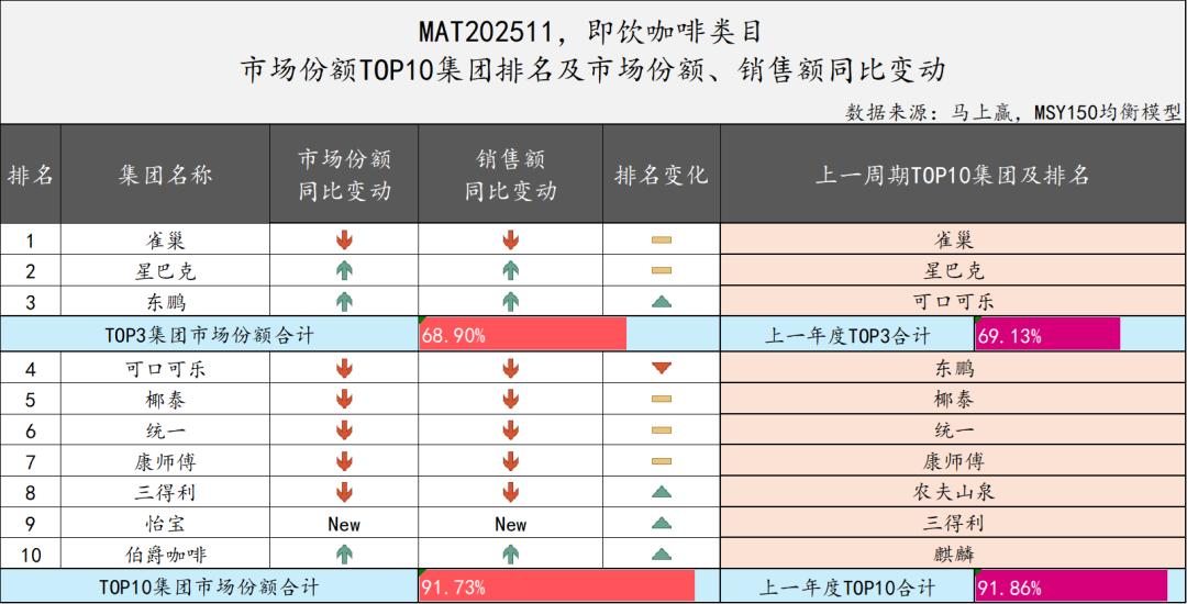 从TOP10集团来看,市场份额合计为91.73%,相较上期微弱下降,排序第4-8名的集团的市场份额、销售额同比均呈下降。怡宝、伯爵咖啡则成为新上榜的集团,分别位列第9、10名,其中怡宝在MAT202511期间推出了新产品系列“焰焙咖啡”,因此其市场份额、销售额同比均为New无上一周期数据,特此说明。三得利集团在即饮咖啡类目中的排序也有提升。