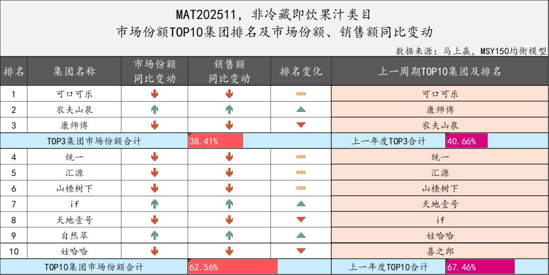 2024年12月至2025年11月,非冷藏即饮果汁类目TOP3由可口可乐、农夫山泉和康师傅构成,TOP3集团市场份额合计38.41%,相较去年有所降低。而从TOP10集团市场份额来看,合计为62.56%,相较上一年度降低了约5%,市场集中度有所降低,更多类型产品、品牌正在参与到这一类目当中。