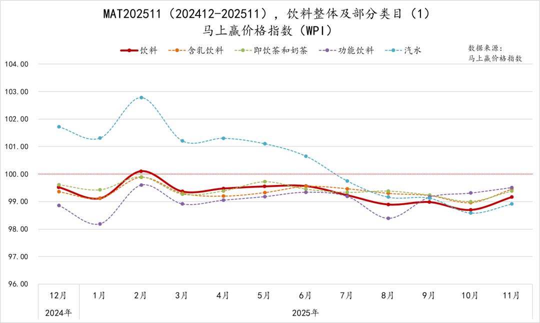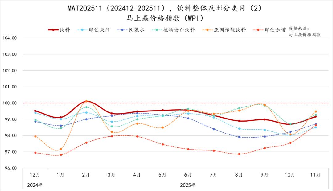 为了更好的观察类目的价格水平变化,我们拉取了饮料整体与各重点类目的马上赢价格指数(WPI),指数以100为基准值,其数值上下波动为类目的价格指数与去年同期价格指数的相对百分比,100表示与去年同月持平,高于100表示同比价格水平上升,低于100则表示同比价格水平下降。