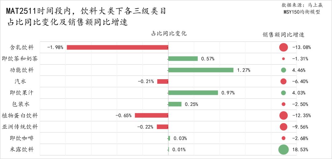 从各三级类目在MAT2511、MAT2411两个时间段的占比来看,含乳饮料是饮料大类中唯一占比超过20%的类目,即饮茶和奶茶、功能饮料、汽水、即饮果汁和包装水的占比均超10%,植物蛋白饮料占比约8%、亚洲传统饮料(凉茶、酸梅汤、植物饮料等)占比约4.5%,即饮咖啡占比约1.5%,米露饮料占比不足0.1%。