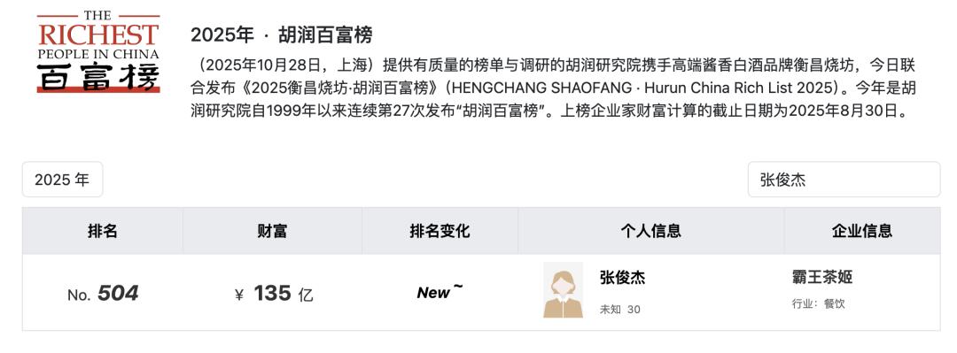 2025年,张俊杰也凭借霸王茶姬上榜《胡润百富榜》,以135亿元的财富值位列第504名,与高纪凡家族的差距只有23名。而从一名孤儿到如今的“富豪”,张俊杰只用了15年。