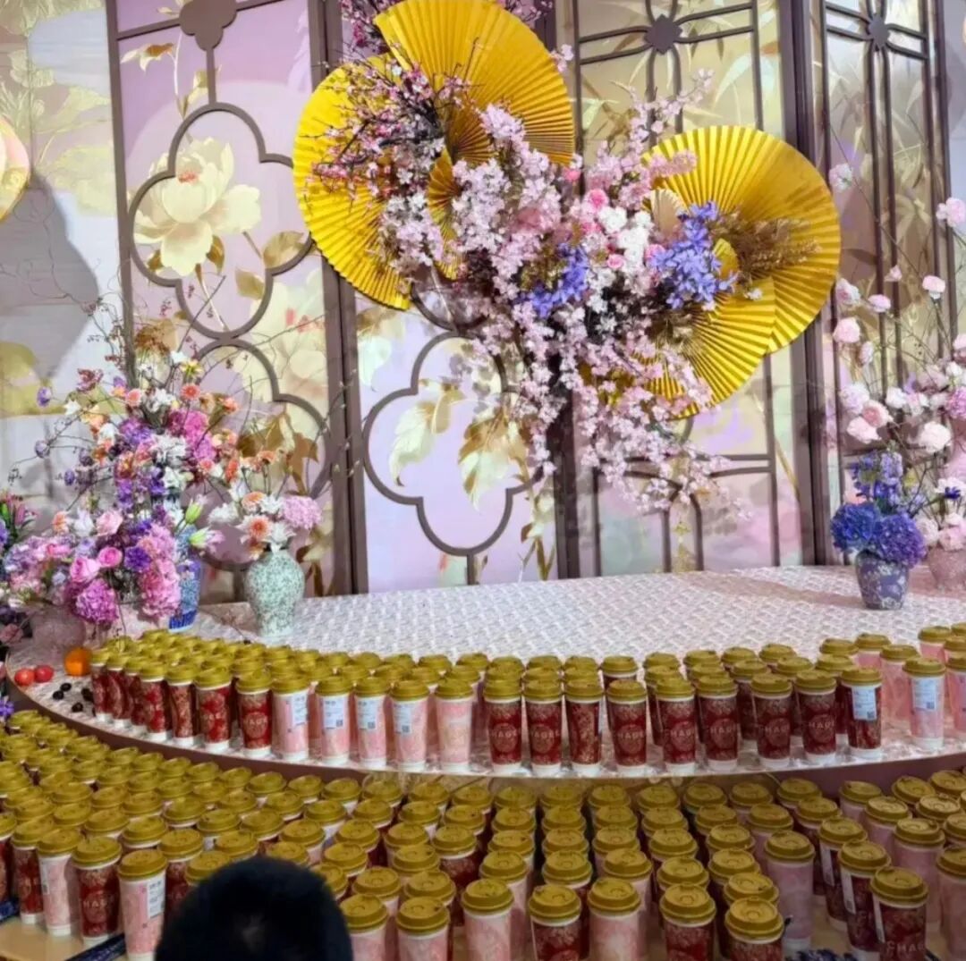 据在婚礼现场的人介绍,来宾们人手一杯霸王茶姬奶茶。此外,“新郎官”张俊杰还向霸王茶姬全国门店送喜糖。