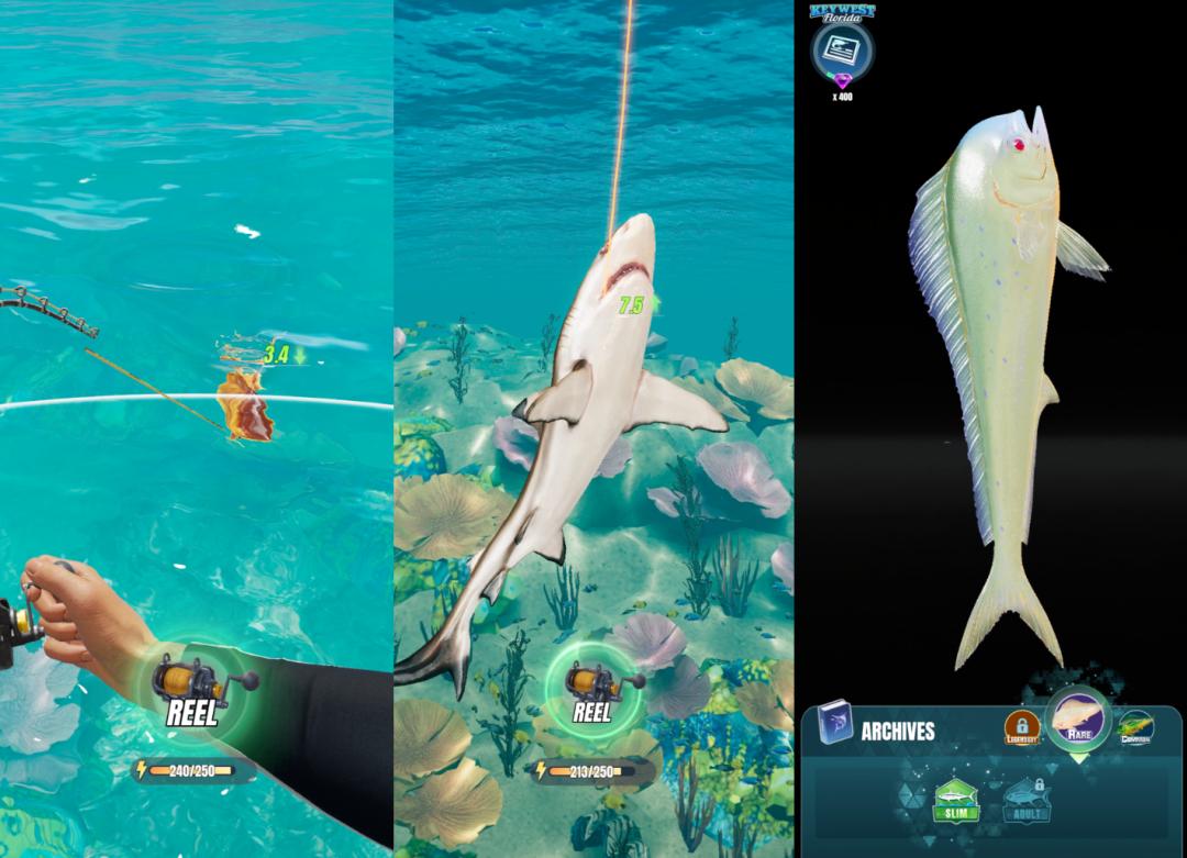 游戏玩法类似于《Monopoly Go!》的框架,玩家需要在不同的海域中垂钓,每当有鱼上钩时消耗一定的体力。游戏过程中有简单的QTE互动,比如长按按钮进行拉线、上划进行放线等。除了在海平面垂钓之外,游戏中还制作了大鱼吃小鱼的奖励环节,提供了更强的奖励反馈。