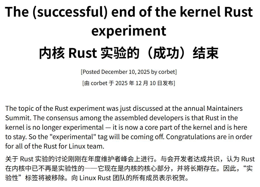而在 2025 年 Linux Kernel Maintainers Summit(内核维护者峰会)上,这一实验已被正式宣布结束。因此,现在可以移除相关章节——事实上,这个‘实验’说法早就不准确了,因为 Rust 已在生产环境中被实际使用了。”