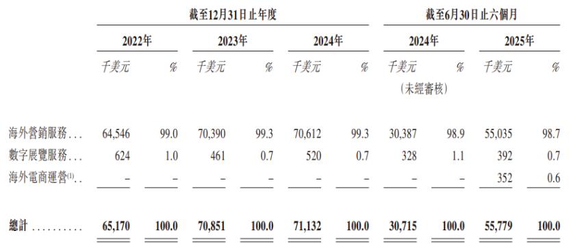 具体来看,2022年至2025年上半年(简称“报告期”),海外营销服务为米多多贡献了98%以上的收入,为重要收入来源。