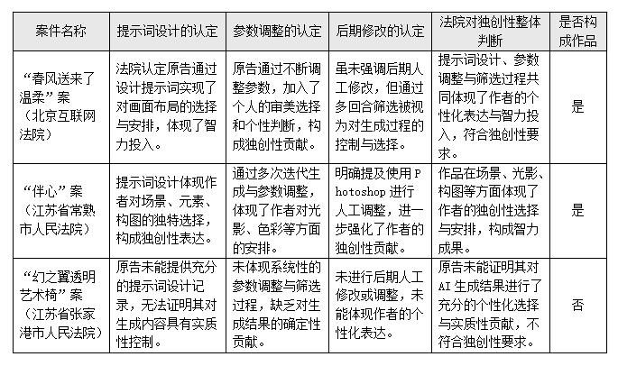 与之相对,中国法院对于人工智能生成物(AIGC)独创性标准似乎更为宽容,若人工智能生成物(AIGC)作者能够在图片的场景、光影、构图等方面彰显作者独创性的选择和安排,经过多轮修改、迭代或者直接调整,则更有可能被认定为具有独创性。但部分法院也明确在相应案例中划定了人工智能生成物(AIGC)独创性底线,“幻之翼透明艺术椅”案中,江苏省张家港市人民法院认定“文生图人工智能软件使用者难以仅通过一轮简单的提示词和参数输入就能决定最终的图片表达”。10上海市黄浦区人民法院在(2025)沪0101民初14775号民事判决书中亦载明,“人类投入必须是创造性而不是劳动性”。11