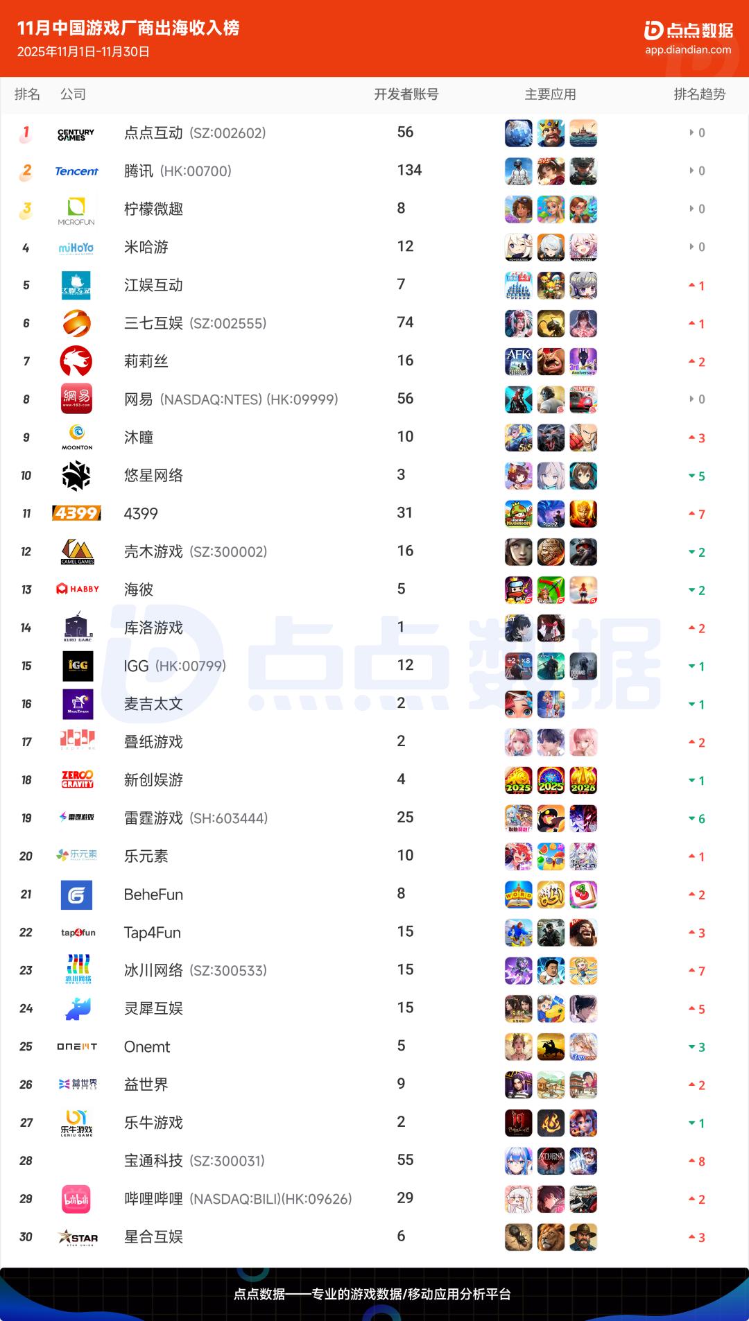 出海厂商:2025年11月中国应用/游戏厂商出海收入Top30榜