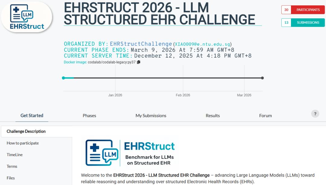 同时发布的还有EHRStruct 2026 - LLM结构化电子病历挑战赛(EHRStruct 2026 - LLM Structured EHR Challenge),旨在为研究者提供一个统一、严谨且可对比的LLM处理结构化EHR能力的评测平台,可直接作为论文实验结果的标准基准。