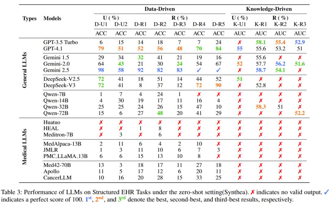 - 通用大模型优于医学专用模型:在结构化EHR任务上,通用LLM整体表现明显优于医学领域模型,其中闭源商业模型(特别是 Gemini 系列)取得了最佳结果。