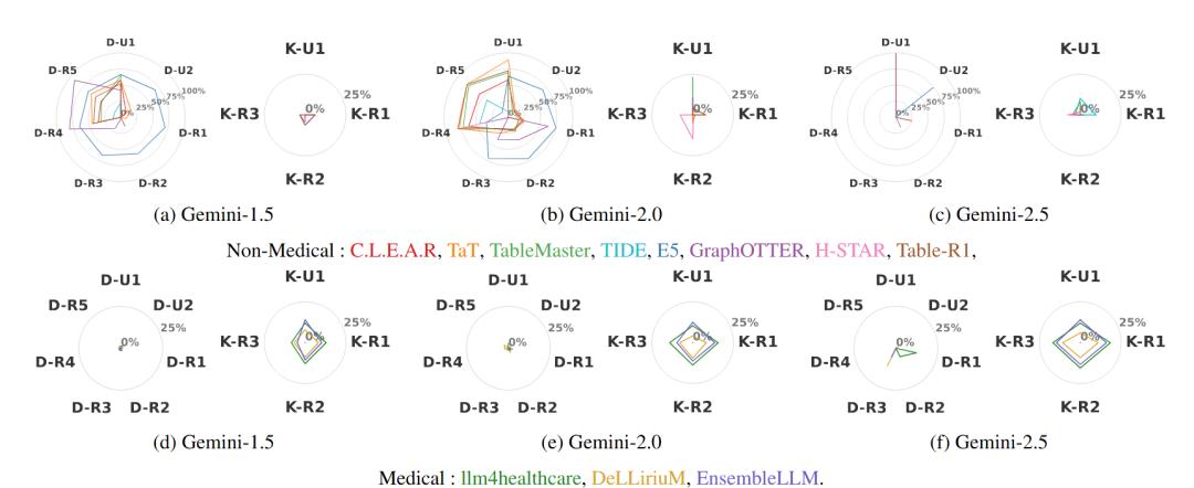 研究人员复现并评估了11种代表性SOTA方法,涵盖8种通用非医疗模型与3种医疗专用模型,结果揭示了显著的性能割裂:通用方法擅长数据驱动的逻辑与数值推理,但在临床知识任务上表现平平;反之,医疗方法虽精通疾病预测等知识驱动任务,却难以泛化至通用数据场景。