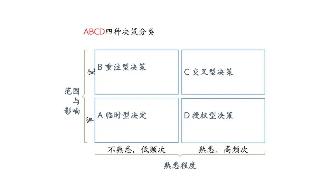 1. 定期开展战略务虚会,共享战略大图, 从“影响范围和熟悉程度”维度区分组织的四类决策, 监视高管团队如何分配自己和团队的时间,进行深度觉察病提出改进方案;
