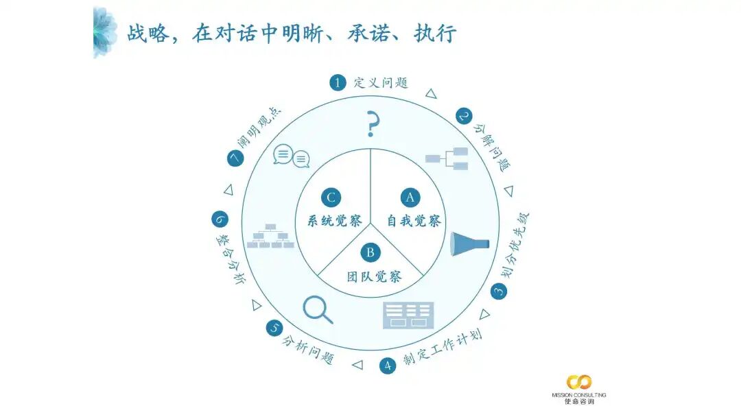 战略对话, 一共七个步骤,环环相扣,步步深入,在每一个环节我们都会留出足够时间给高管团队做“个人觉察、团队觉察和系统觉察。”