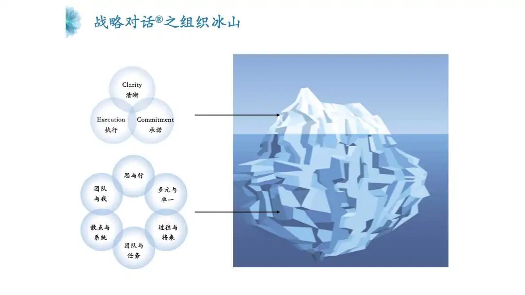 一家公司的战略升级和组织转型的清晰度、承诺度和执行力, 取决于每一个领导者自我认知和行为的跃迁、一个高管团队集体心智模式的察觉与进化和一个组织冰山下根本假设和身份标签的挪移。