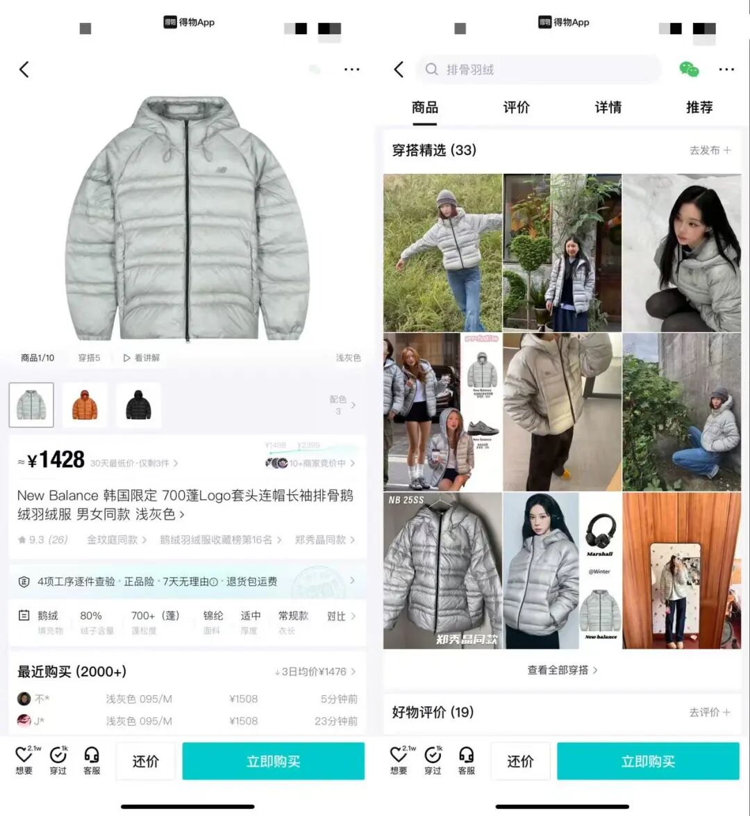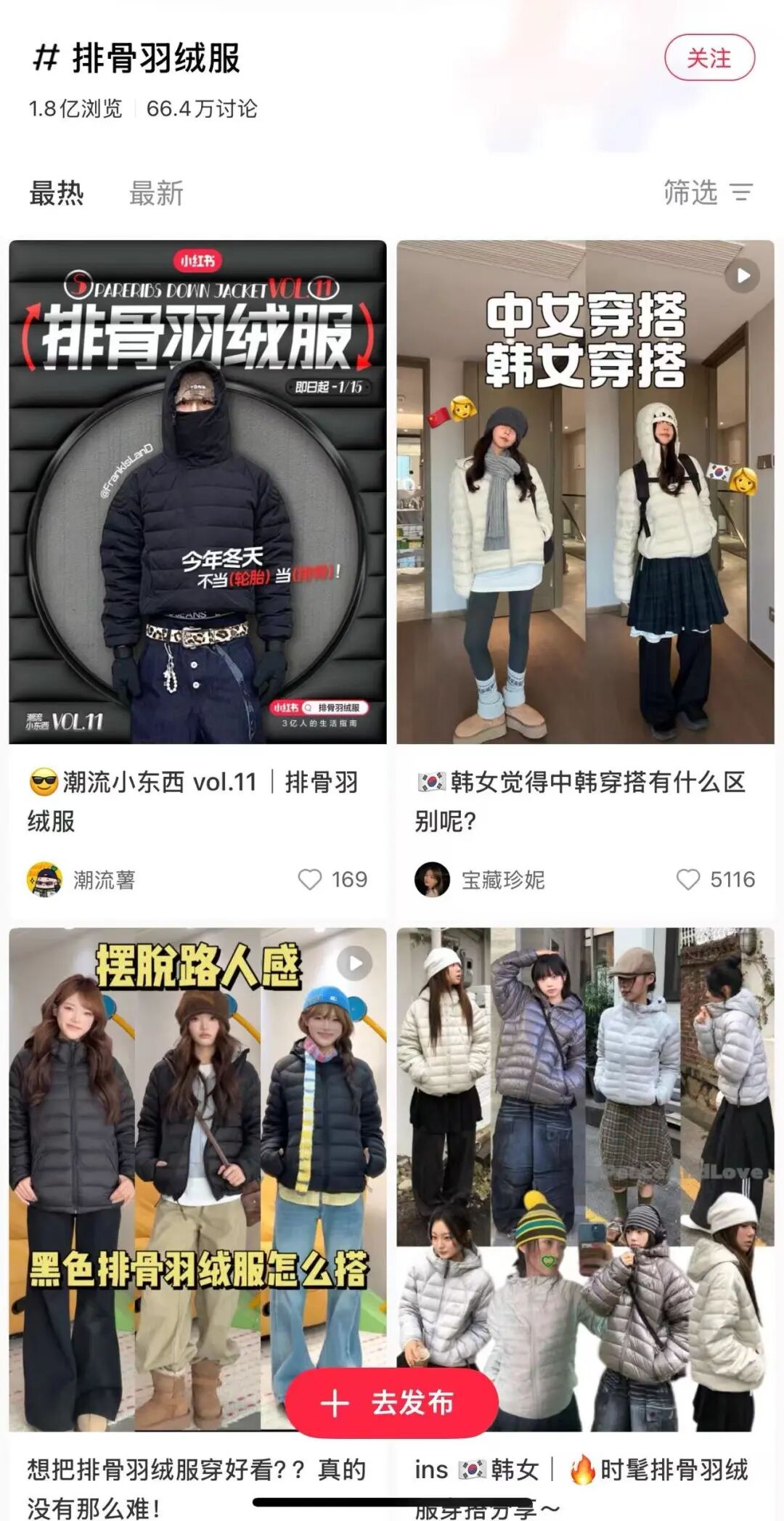 在小红书平台,#排骨羽绒服 词条累计获得1.8亿流量,多篇笔记互动量过万,热门穿搭笔记点赞获得1.4万点赞。