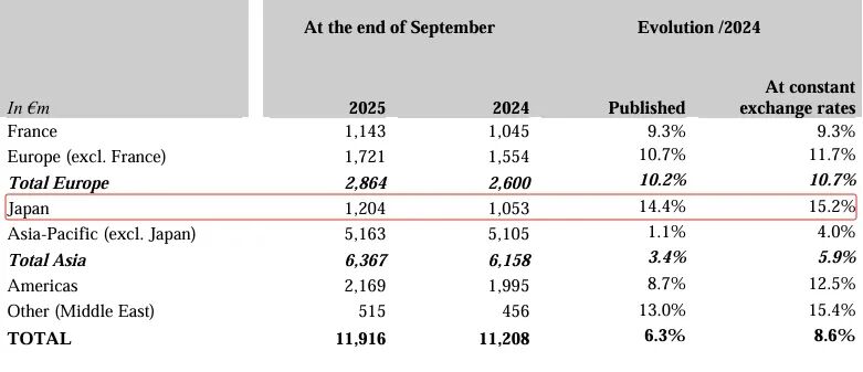 今年前三季度,爱马仕日本市场总销售额同比增长15.2%至12.04亿欧元,远高于亚太地区(除日本)、法国和美国。