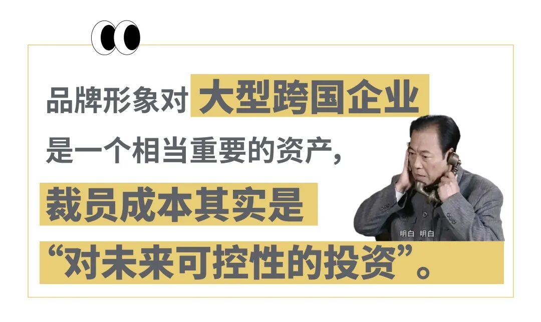 外企们通常还要受到更多方的监管,包括国际投资机构、全球总部等等。雇主形象、每年的ESG评级,也会影响投资人的印象和公司股价。品牌形象对大型跨国企业是相当重要的资产,裁员成本其实是“对未来可控性的投资”。