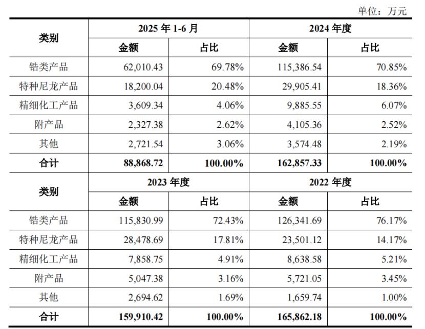 长裕集团收入的主要来源为锆类产品及特种尼龙产品。