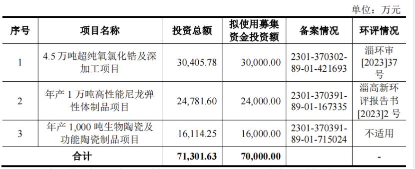 公司本次计划募集资金7亿元,主要用于4.5万吨超纯氧氯化锆及深加工项目、年产1万吨高性能尼龙弹性体制品项目、年产1000吨生物陶瓷及功能陶瓷制品项目。