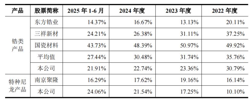 其中,锆类产品毛利率由2022年的30.79%下降至2025年上半年的21.91%,主要是因为锆类产品销售价格下降幅度大于成本下降幅度。