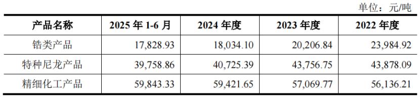 2022年至2025年上半年,公司特种尼龙产品的销售单价由4.39万元/吨下降至3.98万元/吨,也是因为原材料二元胺和二元酸的采购均价下降所致。