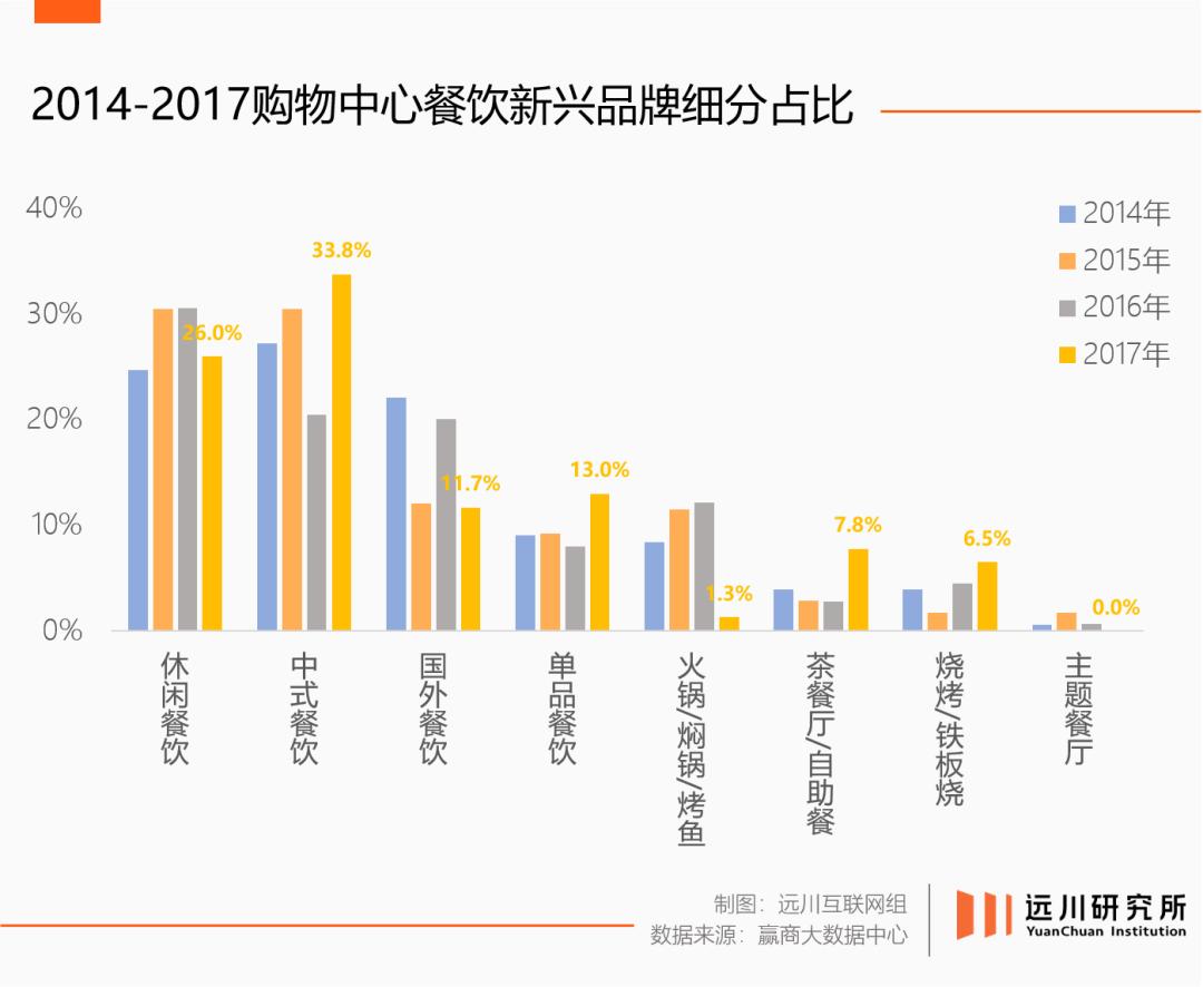 按照赢商的数据口径,2014-2017年,新中式餐饮在购物中心的占比逐渐提升。太二、西贝、绿茶等成规模的餐饮品牌,频频出现在各大购物中心的首批入驻名单中。