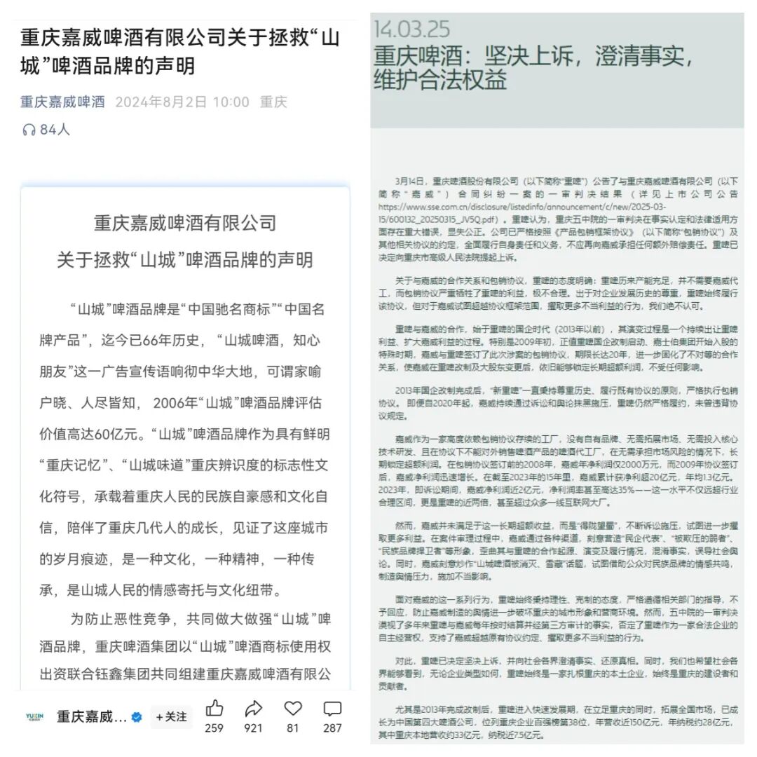 2024年8月,重庆嘉威通过官微呼吁《拯救“山城”啤酒品牌》,将其与重庆啤酒之间的商业纠纷,上升到一个民族品牌生死存亡的高度。