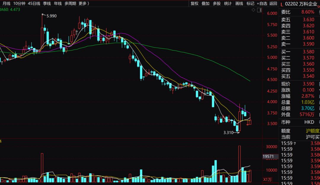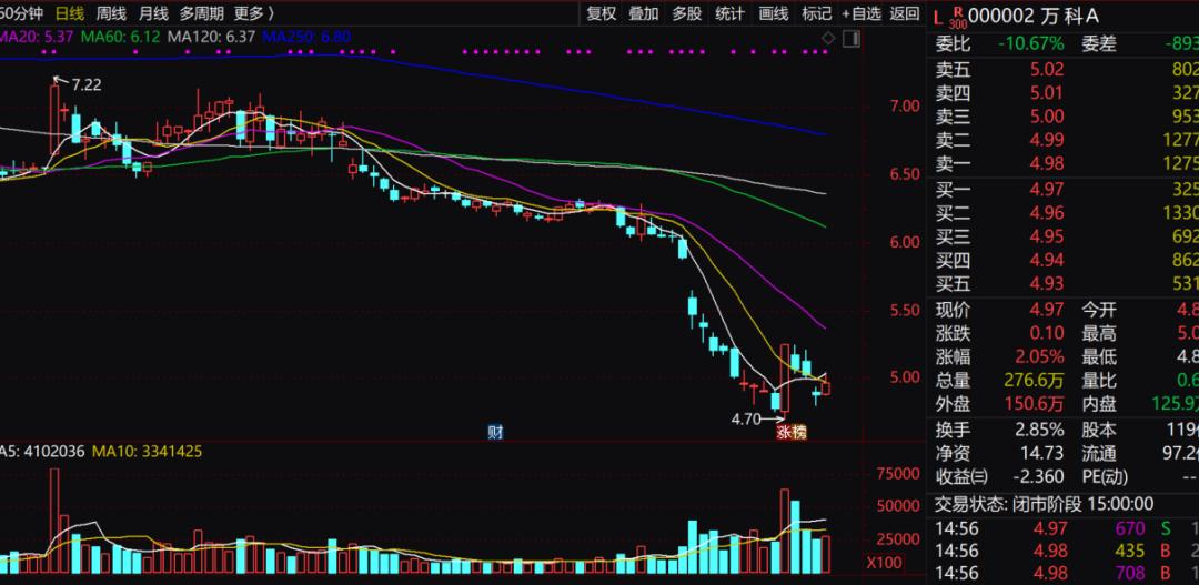 12月15日清晨,万科A的股价在开盘铃声中击穿5元关口,全天低位震荡,截至收盘其股价为4.87元/股。与此同时,港股万科企业的股价走势几乎与如出一辙,低开后全天低位震荡,截至当日收盘,其股价下跌5.16%。