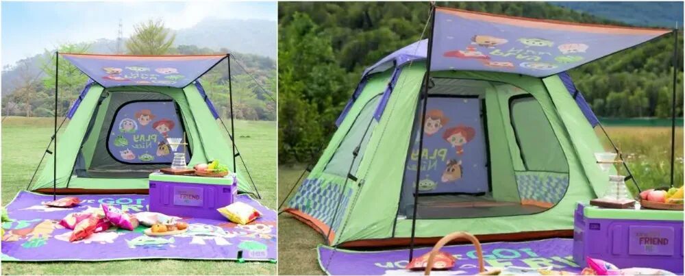 除了食品饮料之外,在沃尔玛的生活区和玩具区也能看到“山姆的影子”。例如,2024年4月前后,山姆上线了一款联名迪士尼《玩具总动员》的帐篷,而2025年12月,沃尔玛也上新了一款联名迪士尼《玩具总动员》的帐篷。而这两款帐篷不论是联名的元素设计、配色和样式都十分接近。