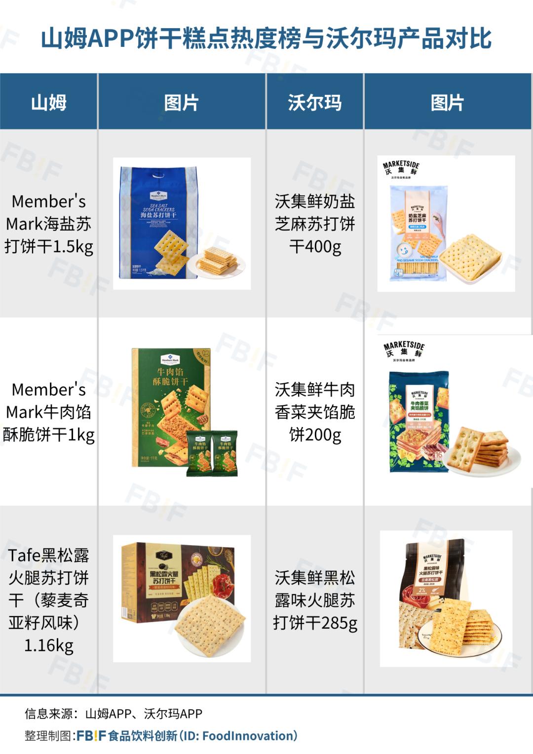 当然,这些产品并非1:1复刻。例如山姆的是“海盐苏打饼干”,而沃尔玛则是“奶盐芝麻苏打饼干”,在口味和定位上做了微调。