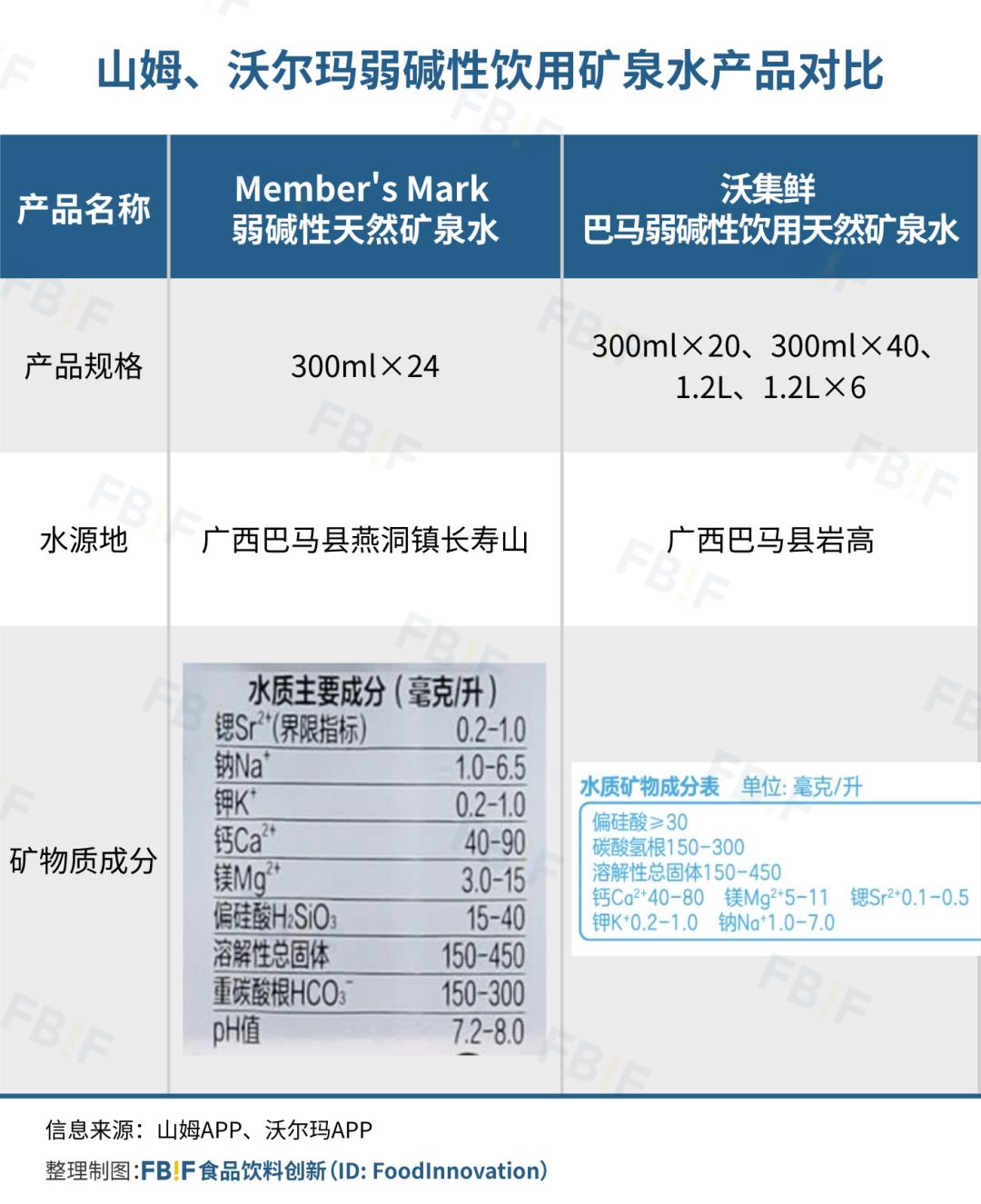 左图为「沃集鲜巴马弱碱性饮用天然矿泉水」,右图为「Member's Mark 弱碱性天然矿泉水」,图片来源:沃尔玛APP、山姆APP