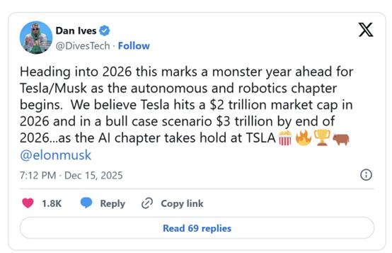 他预计,到2026年,特斯拉的市值将达到2万亿美元,比目前的水平高出约33%,而乐观情境下,其市值甚至可能在2026年底达到3万亿美元。