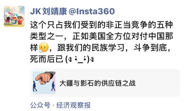 最近大疆和影石的供应链之争,也让两家的战况升级。由于全景无人机影翎上市后反响不及预期,刘靖康写内部信鼓舞士气,还提到影石影翎多家供应商遭遇“排他”压力。