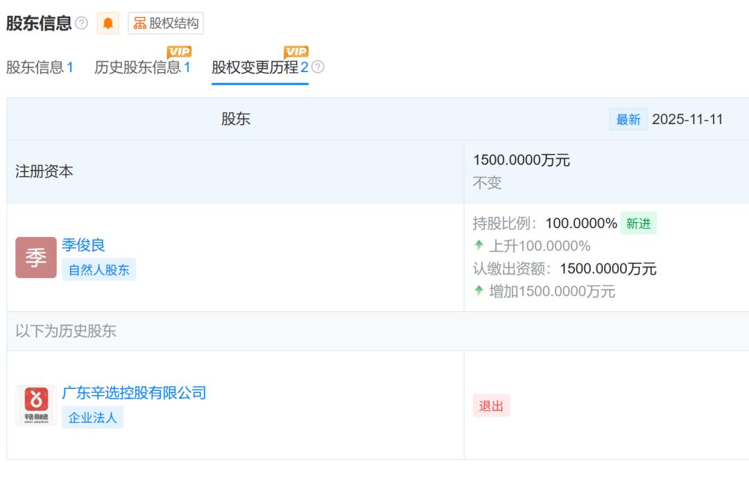《BUG》栏目查询发现,蛋蛋快手主账号店铺主体仍为广州辛润网络科技有限公司。不过,天眼查信息显示,11月11日,该公司全资股东由广东辛选控股有限公司变更为自然人季俊良。