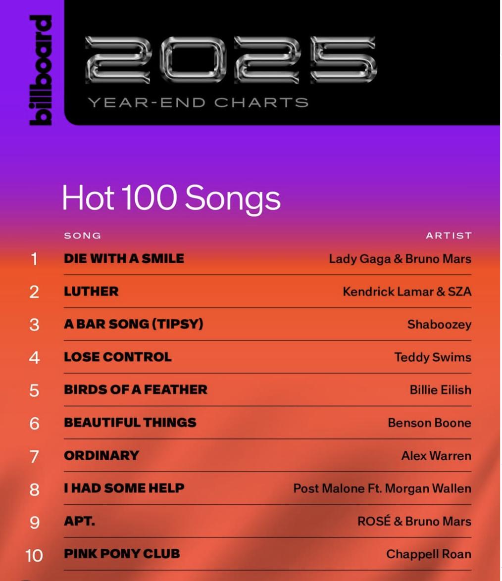 截至目前,Spotify、Apple Music、Billboard等全球音乐平台均已公布2025年度音乐报告,除了总结全球各地用户在过去一年中的个人收听喜好可视化外,最受关注的也莫过于音乐人们的年末成绩单。诸如ROSE、Bruno Mars、Kendrick Lamar、Lady GaGa、Billie Ellish等均成为今年高频出现在各个榜单的座上宾。