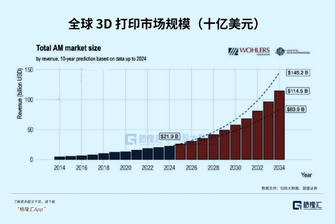 全球3D打印行业早就告别了“小打小闹”的增长阶段,进入了规模化扩张的新时期。根据WOHLERS的统计数据,2024年全球市场规模已经达到219亿美元,按照中性预期,到2034年有望增长到1145亿美元。