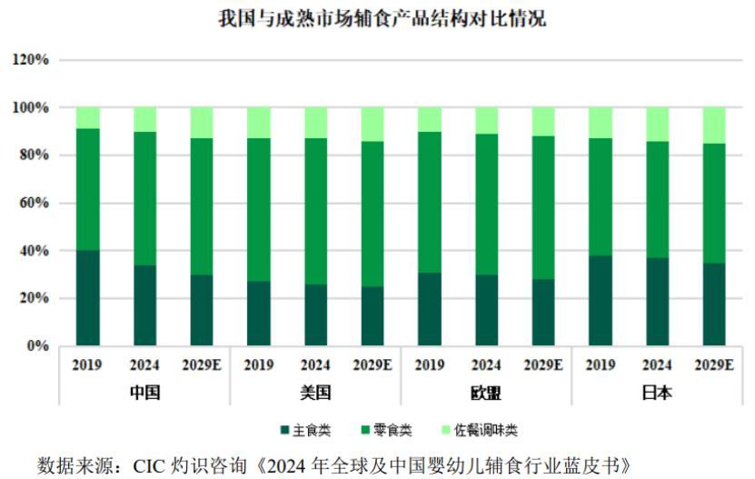 我国消费者喂养方式向高端化、精细化、多品类方向转变,消费习惯向成熟市场靠拢。2024年中国婴幼儿辅食渗透率为38%,相对发达市场仍有较大上升空间,预计到2029年渗透率将提升至51%。