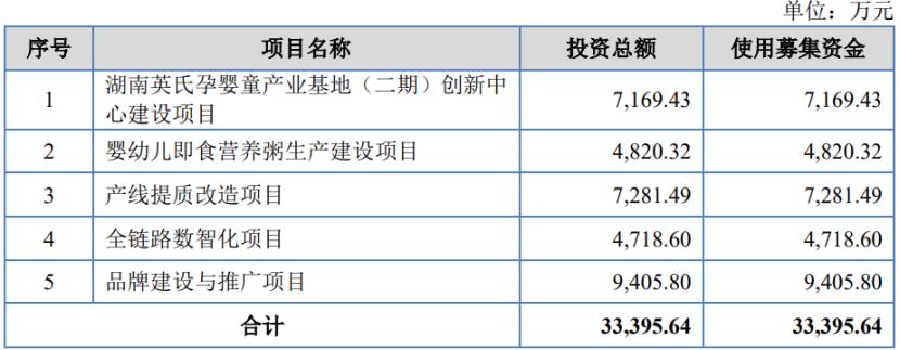 本次IPO,公司拟募集资金约3.34亿元,用于湖南英氏孕婴童产业基地(二期)创新中心建设项目、婴幼儿即食营养粥生产建设项目、产线提质改造项目、全链路数智化项目、品牌建设与推广项目。