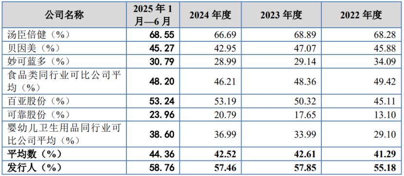 报告期各期,英氏控股的综合毛利率分别为55.18%、57.85%、57.46%和58.76%。其中,公司婴幼儿辅食的毛利率在61%左右,高于贝因美和妙可蓝多,低于汤臣倍健;婴幼儿卫生用品毛利率从28.12%增长至43.77%,低于百亚股份,高于可靠股份。