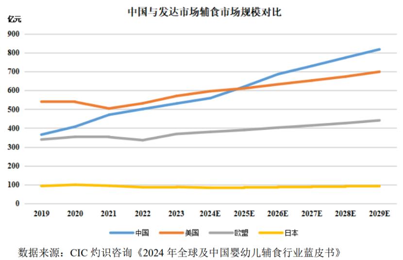2024年,我国婴幼儿辅食市场规模为559.1亿元,仅次于美国的595.7亿元。随着我国婴幼儿辅食渗透率的持续提升,预计2025年我国婴幼儿辅食市场规模将超越美国,成为全球第一大辅食市场。