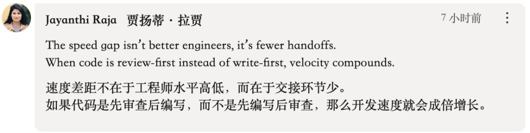 比如,有网友提出,在AI编码场景中,如果把审查、判断、设计(通常需要人类完成)前置,然后再让AI编码,就可以成倍提高开发速度。