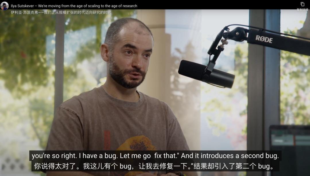 他在谈到为什么目前依赖Scaling(堆算力和数据)越来越难推动AI进展时,提到了一个关于模型在修Bug时陷入无限循环的例子: