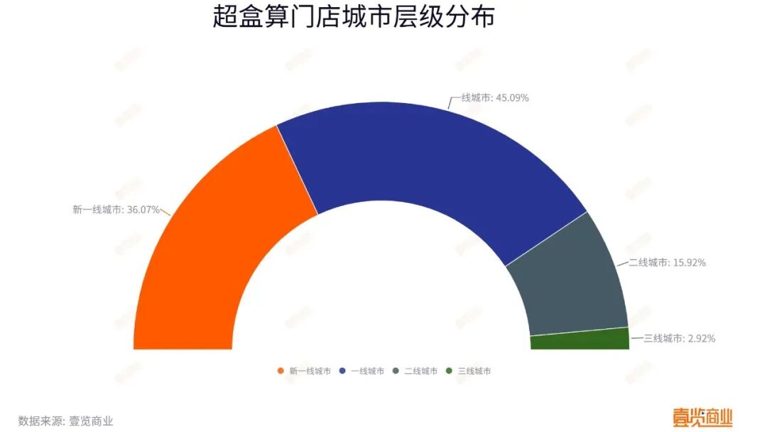 从城市层级看,超盒算偏好高线城市。一线城市门店达170家,占比45.09%,新一线城市门店136家,占比36.07%,二者合计占比超81%;二、三线城市门店71家,占比不足19%。