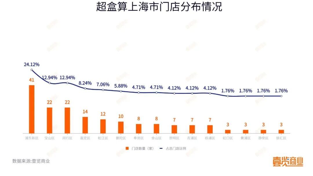 上海作为绝对战略支点,贡献了170家门店,占总门店数的45.09%,覆盖了除长宁区外的15个区。其中,浦东新区门店数量断层领先,超盒算在此设立了41家门店,占上海门店数的24.12%;其次为宝山区与闵行区,均有22家门店,占比达12.94%。