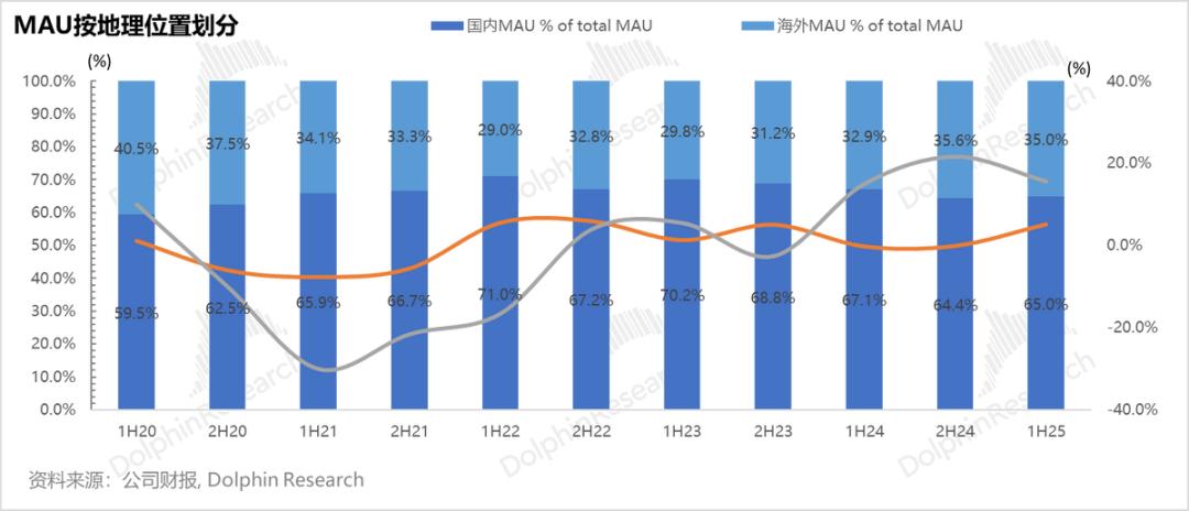 b. 尽管海外MAU同比增速受高基数影响,从2H24的21.7%峰值收窄至 15.7%,但仍保持着双位数的较高增长,占整体用户规模的35%。海外渗透趋势在1H25出现收敛,增速与占比双重下修。
