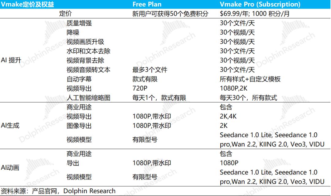 Vmake基本付费才能用。免费版不仅被锁死在 720P 低画质与强制水印的非商用场景中,更无法调用Veo 3 等高阶视频模型,且对许多功能进行了锁定。这种激进的权益区隔与Vmake更具生产力属性(海外用户多用Web端)相关,虽有“劝退”价格敏感型用户的风险,但只要功能体验足够好,总能吸引目标用户付费。