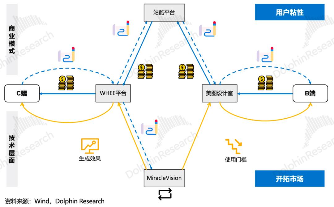 这三大平台在使用过程中,产生的数据和信息,又为公司的Miracle Vision大模型提供训练数据和专业反馈,推动模型持续优化,进而提升生成质量和理解能力,降低用户的专业技能要求和使用门槛。对美图而言,就是降低了获客成本,形成正向业务飞轮。