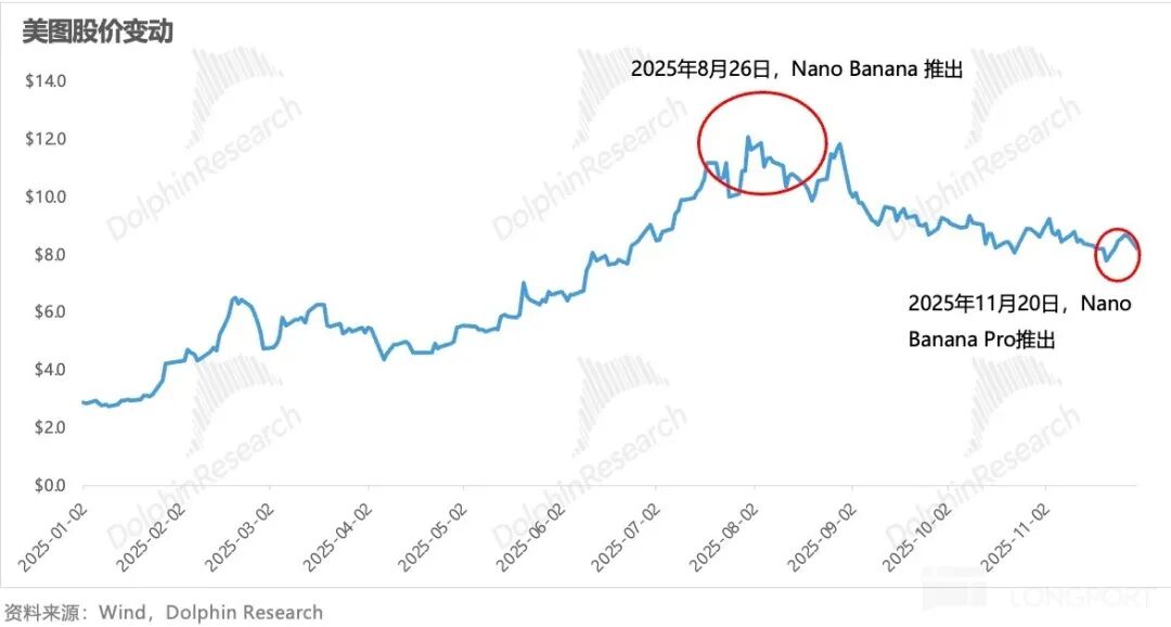 目前,美图和其他AI应用公司一样进入了命题自证阶段。受竞品 Nano Banana 及其迭代版本发布的冲击,公司股价应声下挫(14%/5%),且已经低迷震荡了近四个月。