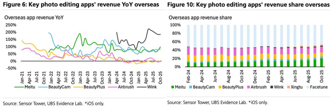 根据UBS十月跟踪数据显示,海外增速方面,Meitu, Beautycam收入同比增长98%/83%;BeautyPlus, Airbrush由于高基数收入增速维稳,同比增长1%/-2%。收入维持稳定。